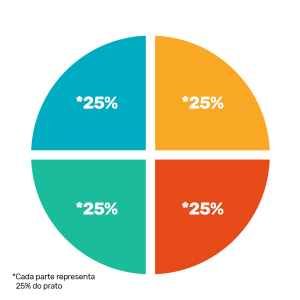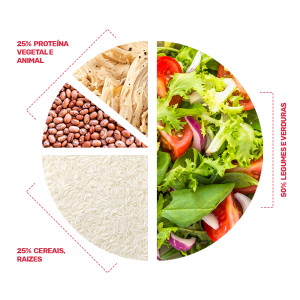 Primeiro, vamos falar das 2 principais refeições, o almoço e jantar, e para ilustrar temos um prato de refeição dividido em 4 partes: